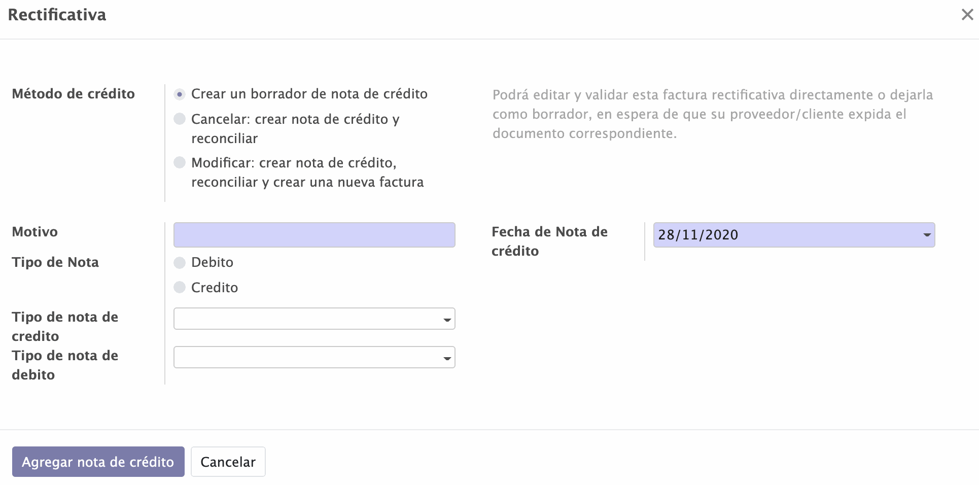 Método de crédito: Es la forma en la que se realizará la modificación de la factura original. Para la mayoría de los casos la opción "Crear" funcionará bien.