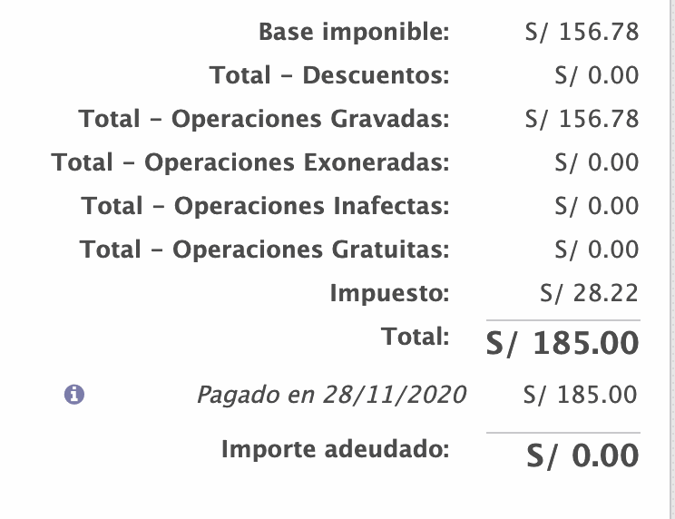 Al seleccionar la factura, se mostrará el detalle completo de la misma. Observe la parte inferior de la factura, donde se muestra el campo "Importe adeudado". Este es el monto aun no pagado de la factura en cuestión.